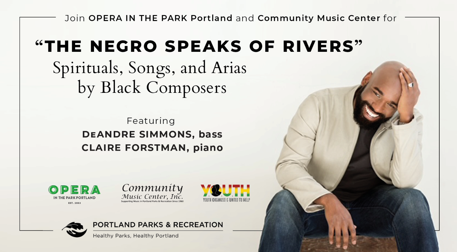 Join us for an unforgettable evening as bass DeAndre Simmons presents "The Negro Speaks of Rivers": a presentation of traditional spirituals, songs and arias by African American composers, made possible by Opera In the Park Portland, The Community Music Center, Inc. (non-profit), Portland Parks & Recreation, and the Center Powered by YOUth.